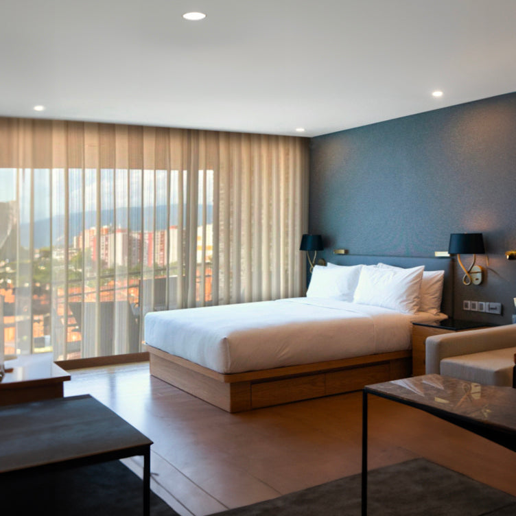 Su tejido decorativo aporta un toque sutil de textura, permitiendo el paso de luz natural de manera suave mientras mantiene la privacidad interior.